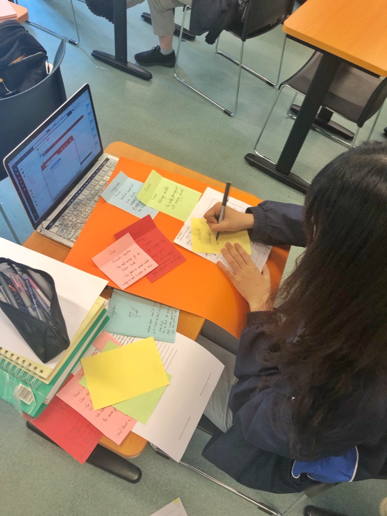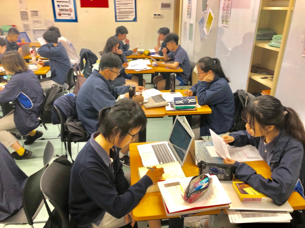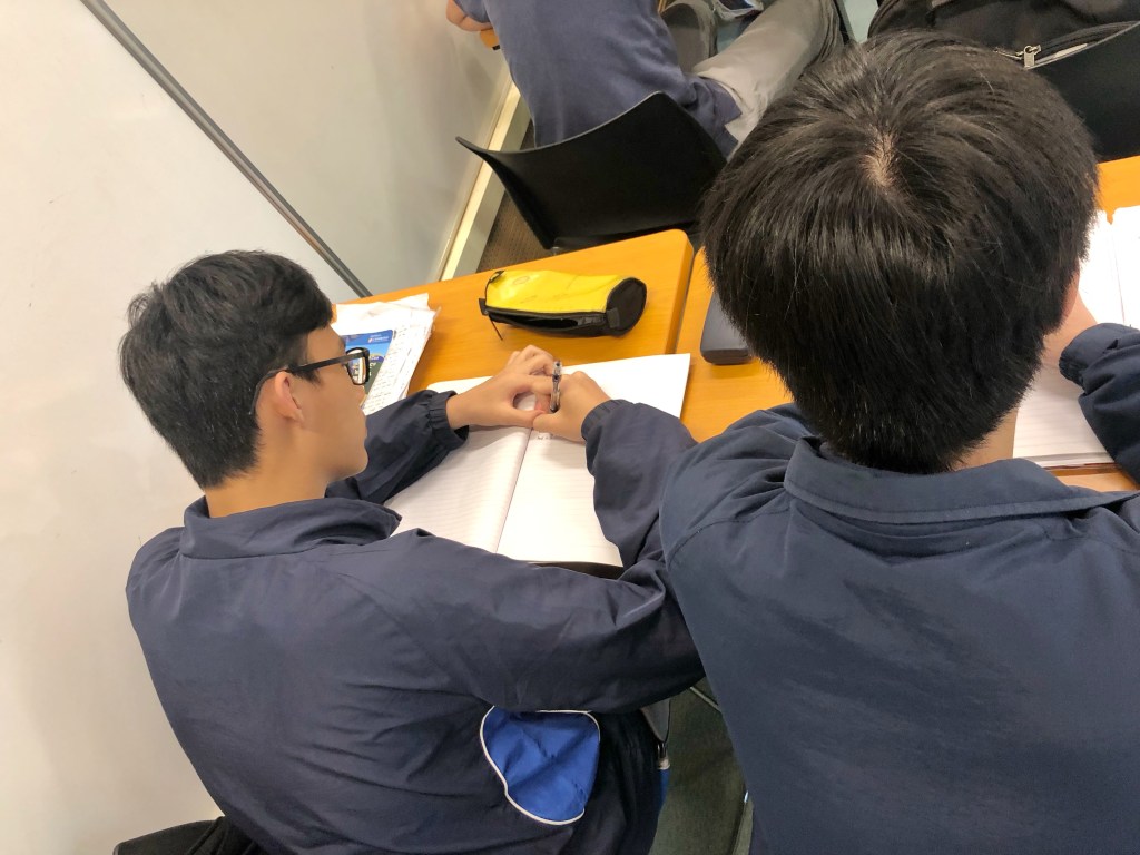 Grade 10B Advanced Class with Ms. Jona Zhang and Ms. Jocelyn YmbongAries Chen creating her story boardWriting Workshop: Creating Character names and describing them using character traits list and the physical traits vocabulary listThiago in action during the interview with Mr. Henry MensahPeer assessment: Practice of the Oral Exam of EFLStudents mentoring each other before the big day of the EFL Speaking Test